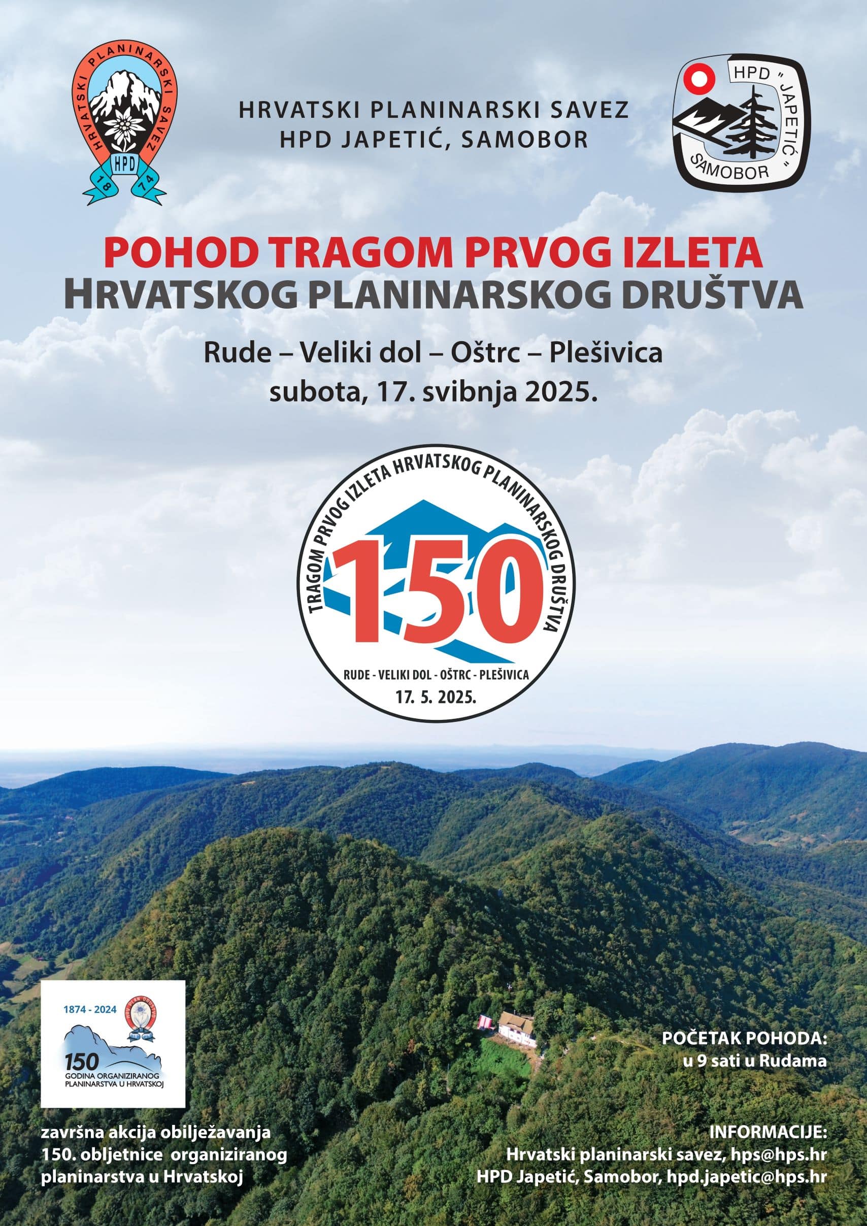 U organizaciji Hrvatskog planinarskog saveza (HPS) i Hrvatskog planinarskog društva Japetić, u subotu 17. svibnja 2025. godine u Samoboru će se održati završni događaj obilježavanja velike 150. obljetnice organiziranog planinarstva u Hrvatskoj – pohod Tragom prvog izleta. Očekuje se velik broj planinara iz svih krajeva Hrvatske koji će zajedno proći trasu Rude – Veliki dol – Oštrc – Plešivica, istu onu koju je 1875. godine obišla skupina od 12 članova tada novoutemeljenog Hrvatskog planinskog društva (HPD) na svojoj prvoj „laznji“.