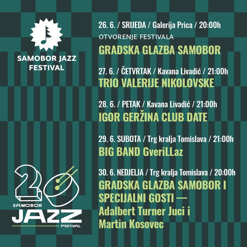 Samobor Jazz Festival 2024. godine, će otvoriti Gradska glazba Samobor, 26. lipnja od 20.00 sati u Galeriji Prica. Dan kasnije, 27. lipnja od 21:00 sati u Kavani Livadić, muzicira Trio Valerije Nikolovske. U petak 28. lipnja na istom mjestu i u isto vrijeme, Kavana Livadić 21:00 sat, možete pratiti koncert pod nazivom Igor Geržina Club Date. Dan kasnije je rezerviran za slovenski Big Band GveriLLaz kojeg ćete moći poslušati na glavnom samoborskom Trgu kralja Tomislava od 21:00 sat. Ovogodišnje izdanje Samobor Jazz Festivala, završava tradicionalnim koncertom Gradske glazbe Samobor, koja će 30. lipnja od 20:00 sati, koncertirati na glavnom samoborskom Trgu kralja Tomislava. Posebni gosti će biti Adalbert Turner Juci i Martin Kosovec.